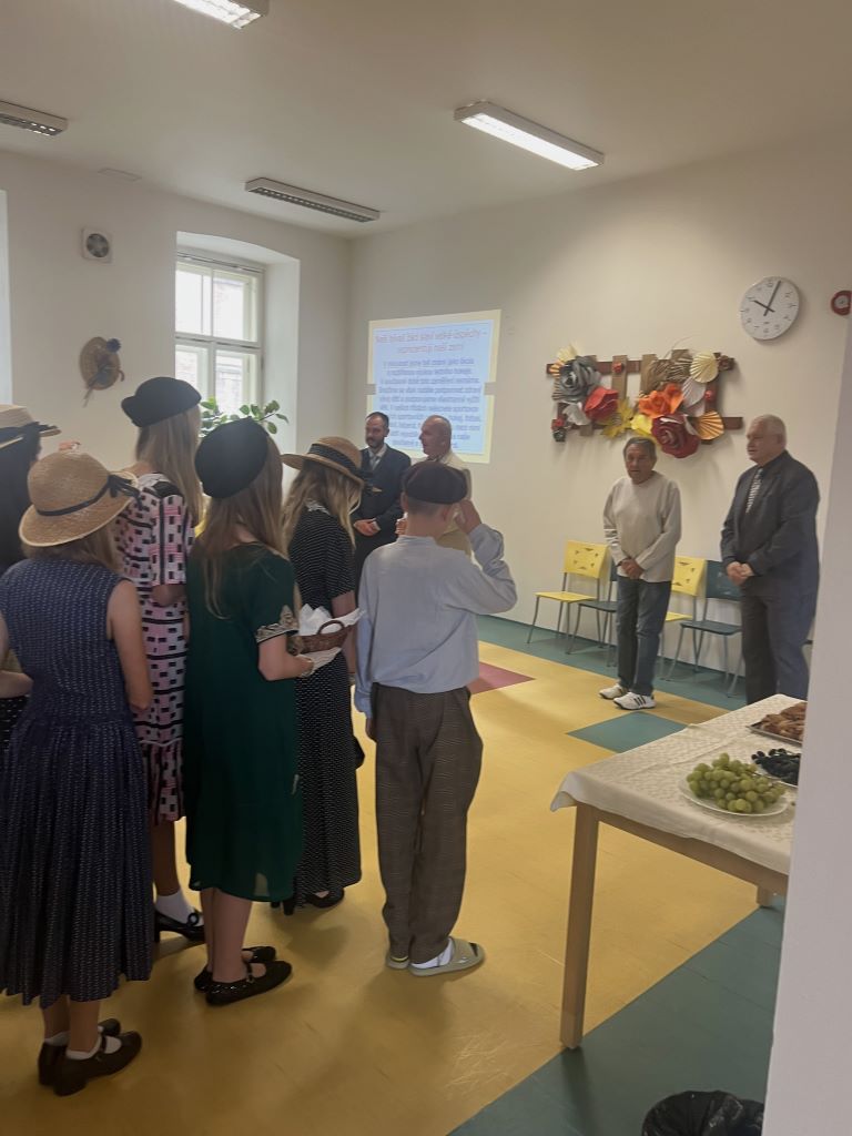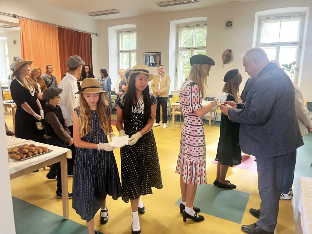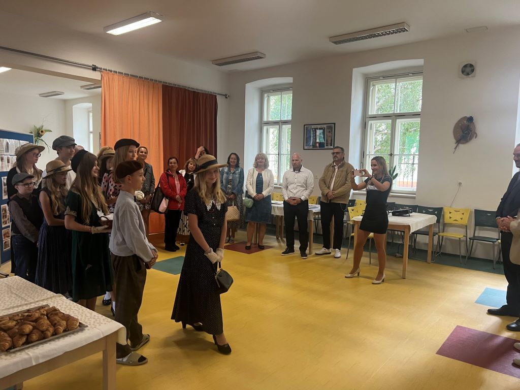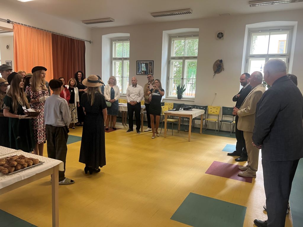 V dopoledních hodinách uvítala skupina žáků v historických krojích vzácnou návštěvu-pana starostu města Mgr. Ing. Michala Kozára MBA v doprovodu 2. místostarosty Ing. Bohumila Komínka, PhDr. Jany Burianové, vedoucí odboru školství Mgr. Leony Šímové a ředitelů základních škol našeho města. Mezi vzácnými hosty byli i bývalí ředitelé naší školy pan Josef Hanuš a Josef Brabec PaedDr. Po zahájení setkání si naše návštěva prohlédla školu a neodmítla pohoštění v školní kuchyňce připravené žáky školy.