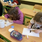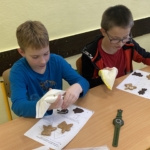 Perníčky, které předem napekli rodiče dvou chlapců z 5.B, čekaly na svou finální úpravu. Děti se s chutí pustily do zdobení polevou, která proměnila jednoduché pečivo v malá umělecká díla. Zatímco jedni pečlivě vykreslovali detaily, jiní neodolali a polevu nejprve důkladně ochutnali.